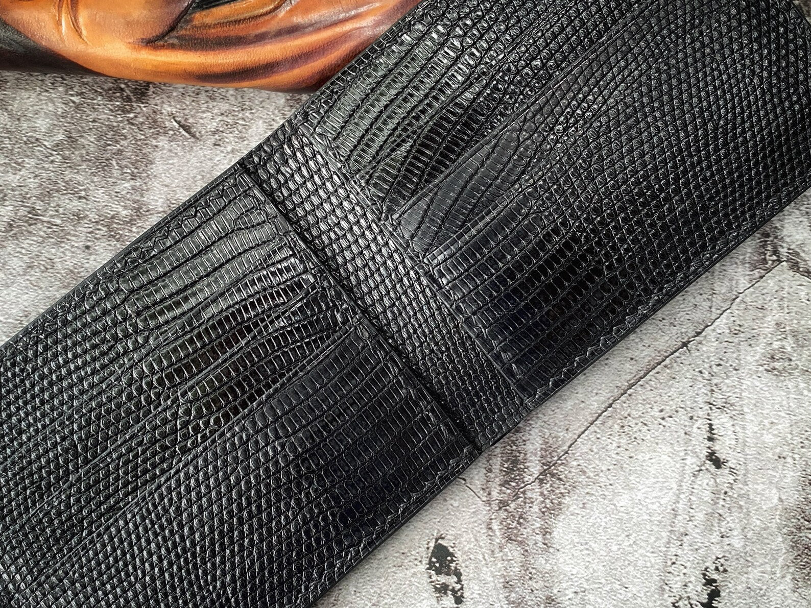 • Material: Lizard skin and cowhide leather
