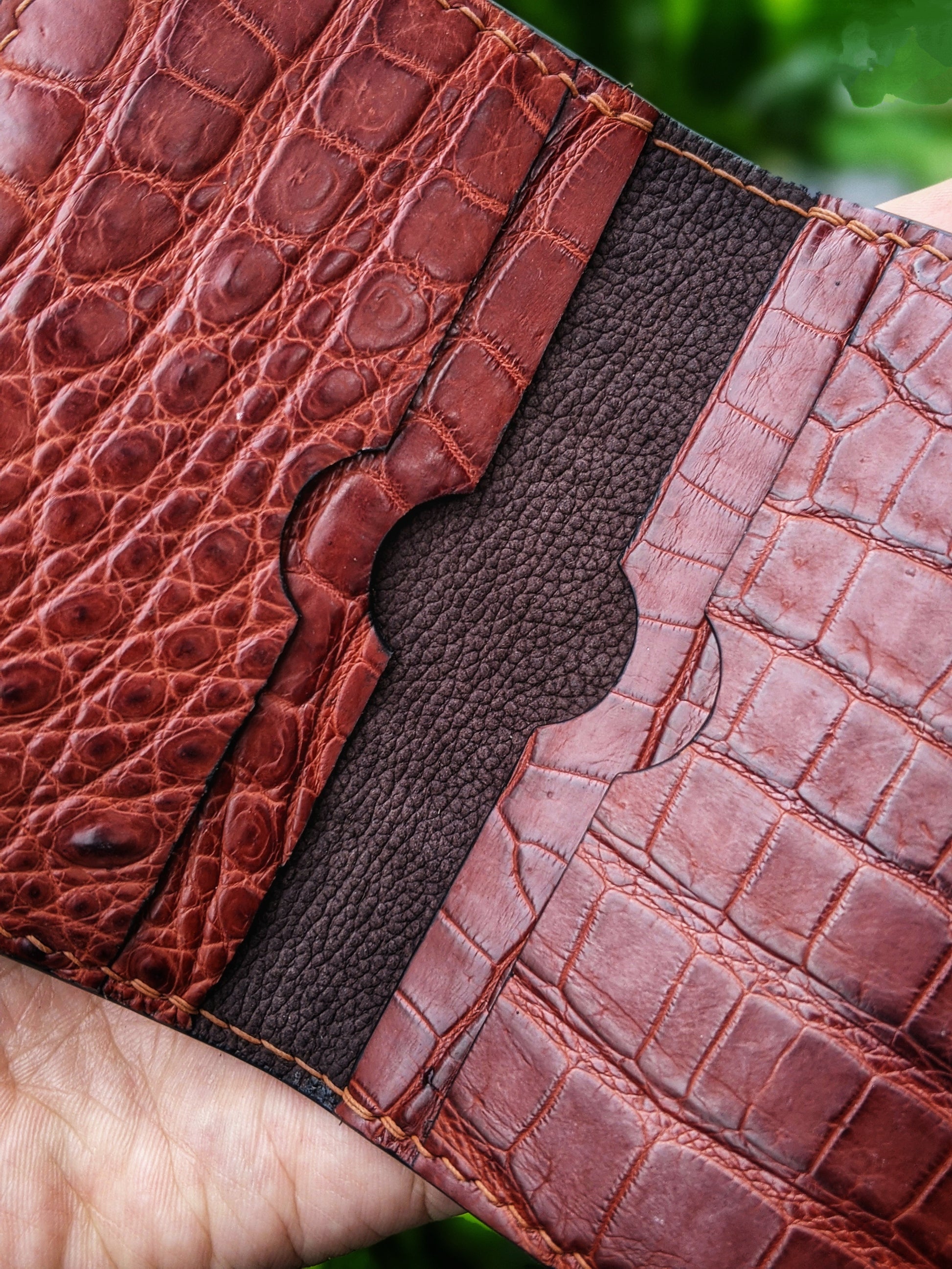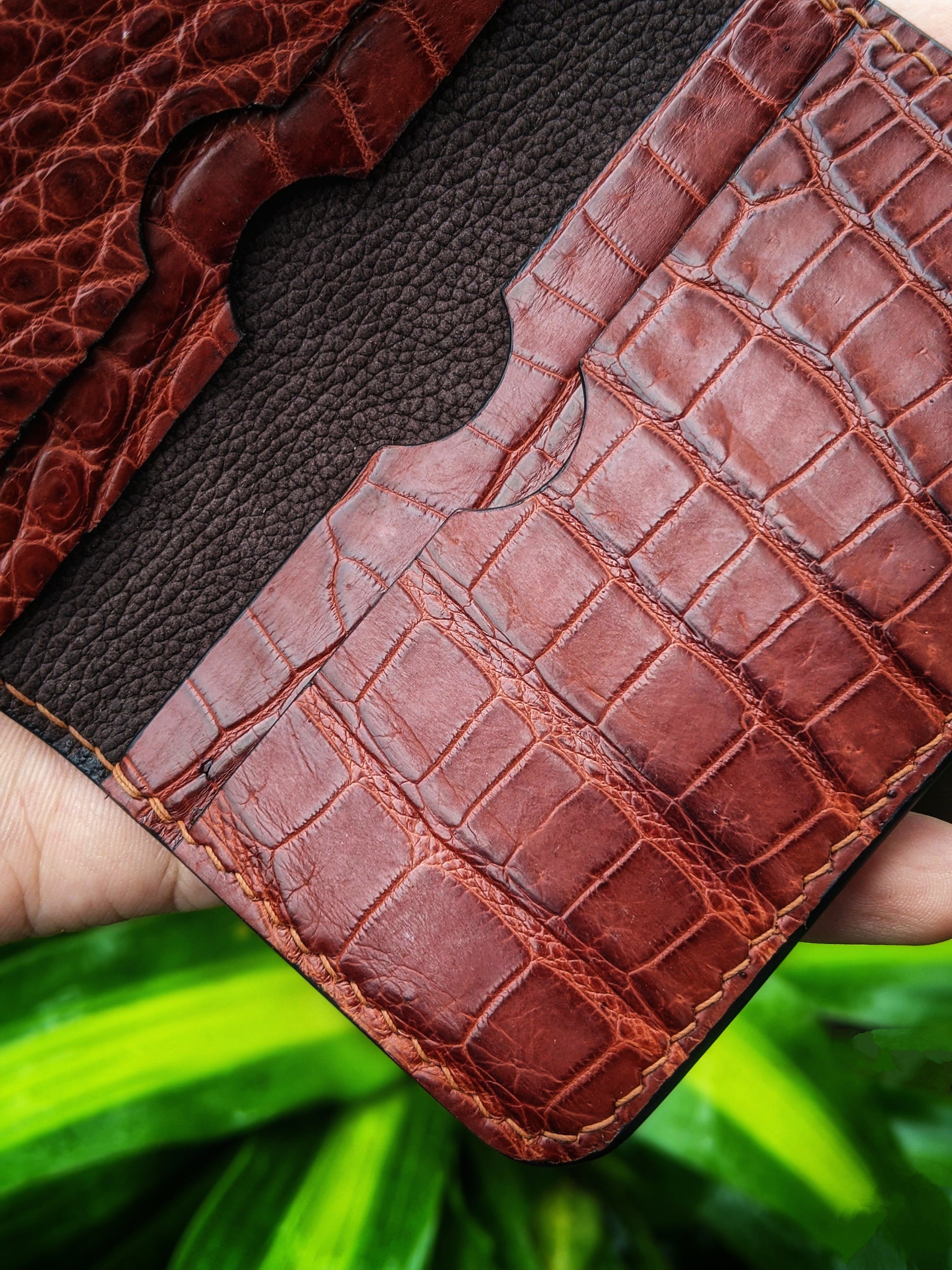 Custom card wallet is totally made by hand and easily made to your order. It is made from Alligator leather outside and cowhide leather for liner. This combination makes the wallet unique.
