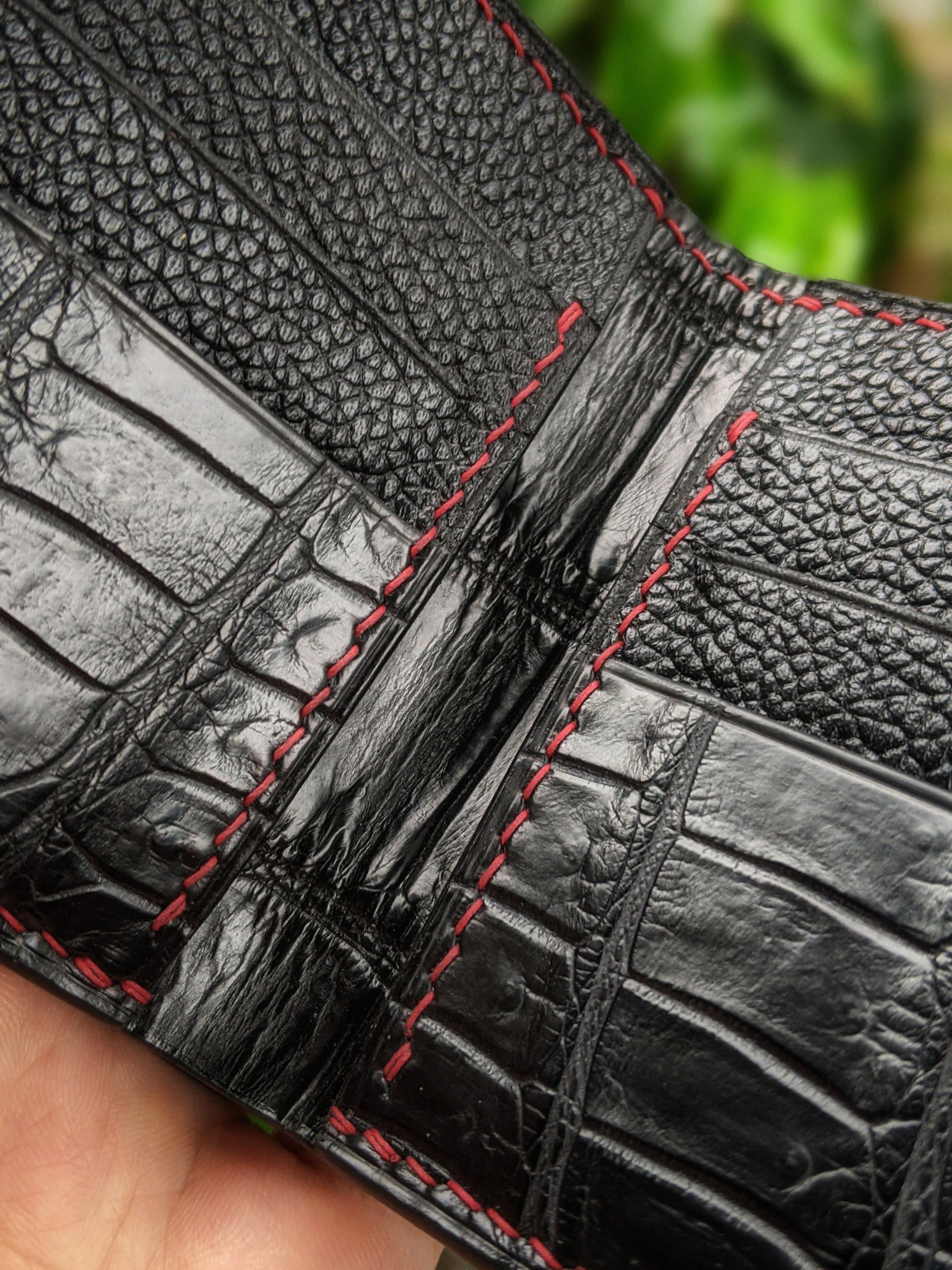 Handmade wallet is made of genuine Alligator Skin, featuring with cowhide leather. This combination makes the wallet look unique, soft to touch and flexible to put in your front pocket.