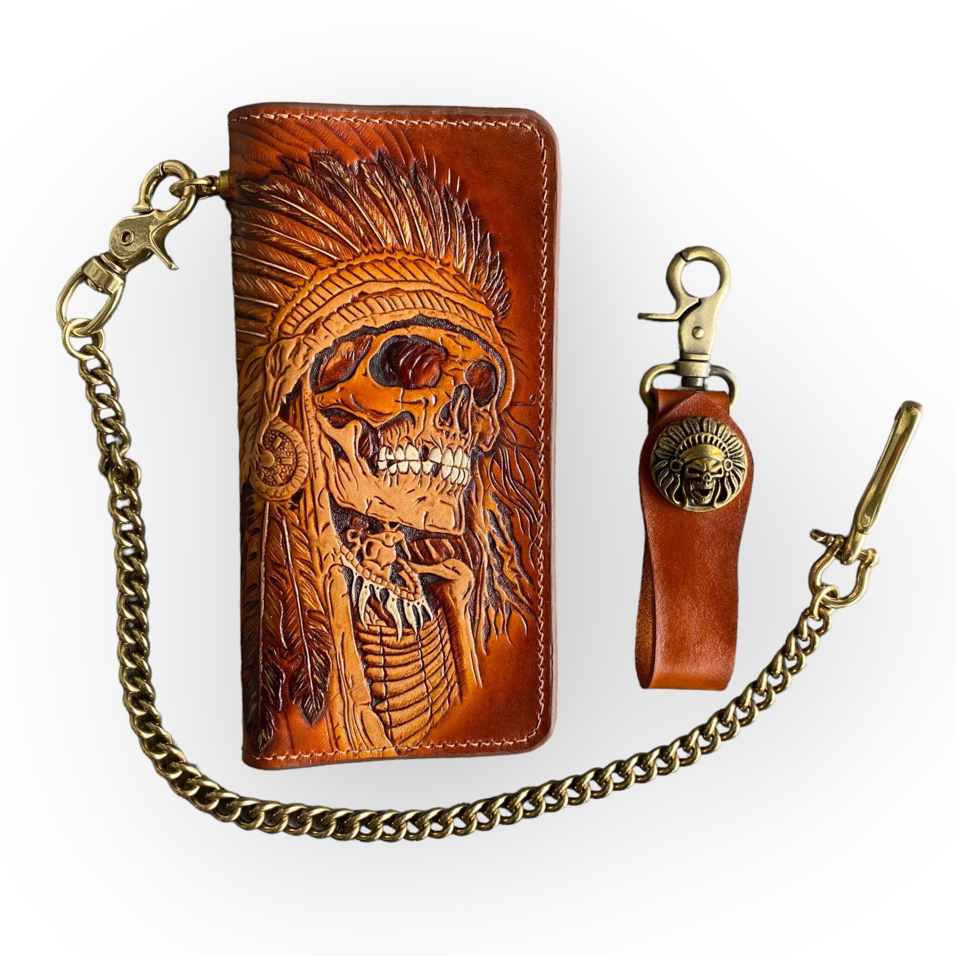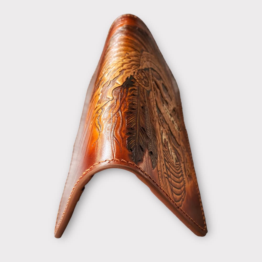 Leather carving wallet works of art by a process of cutting and stamping the surface. It was made from Italian vegetable tanned leather which is a high quality leather. The artist used special images for this wallet.