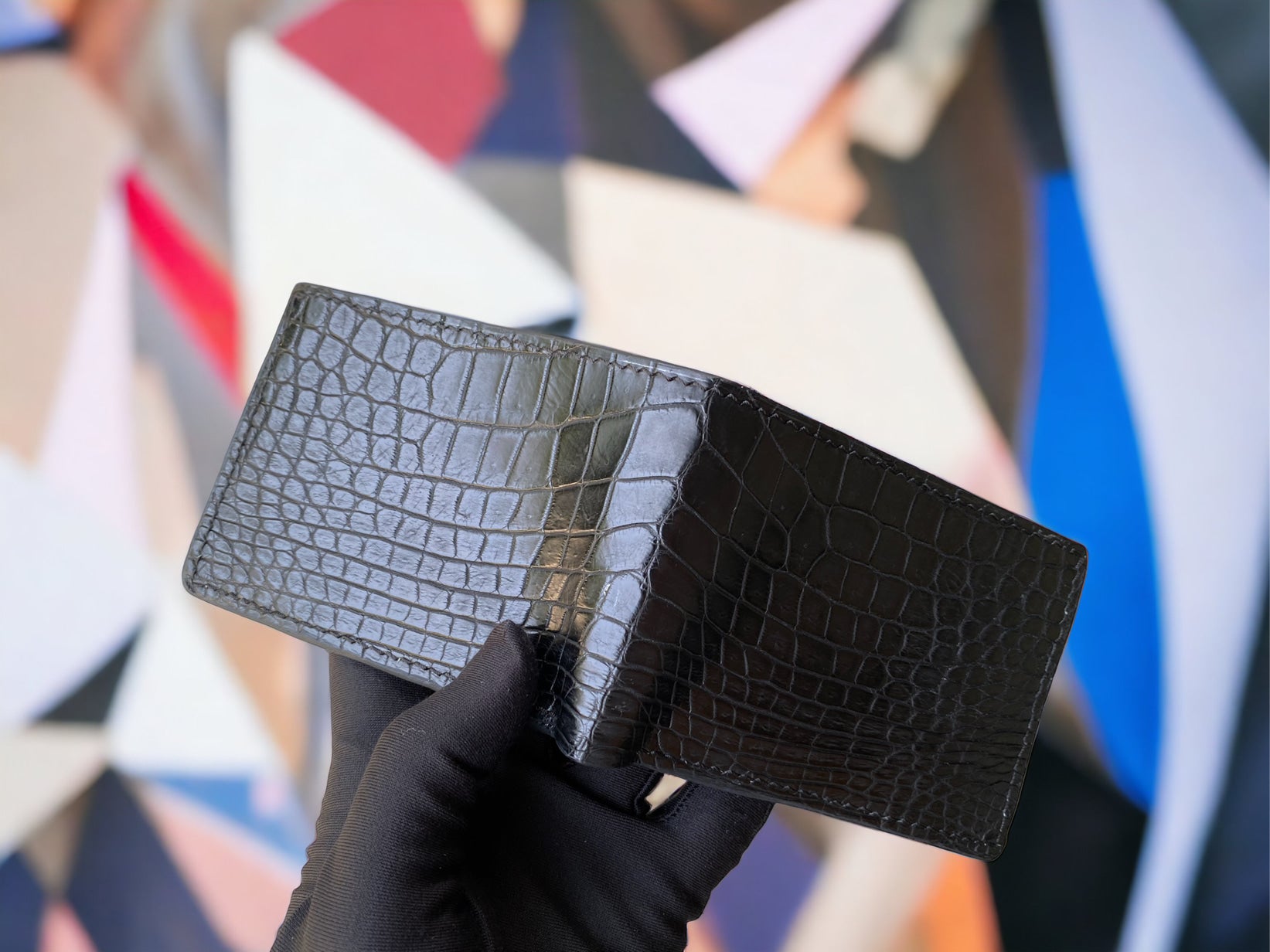 Handmade bifold wallet is made of genuine alligator, featuring with cowhide leather. This combination makes the wallet look unique, soft to touch and flexible to put in your front pocket.