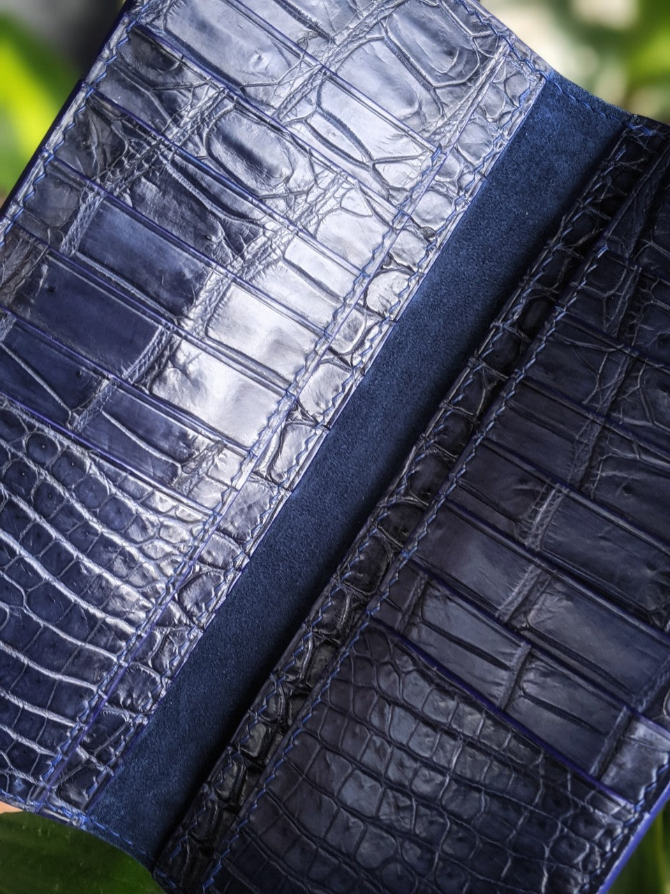 Handmade long wallet is made of genuine Alligator leather, featuring with cowhide leather. This combination makes the wallet look unique, soft to touch and flexible to put in your front pocket.