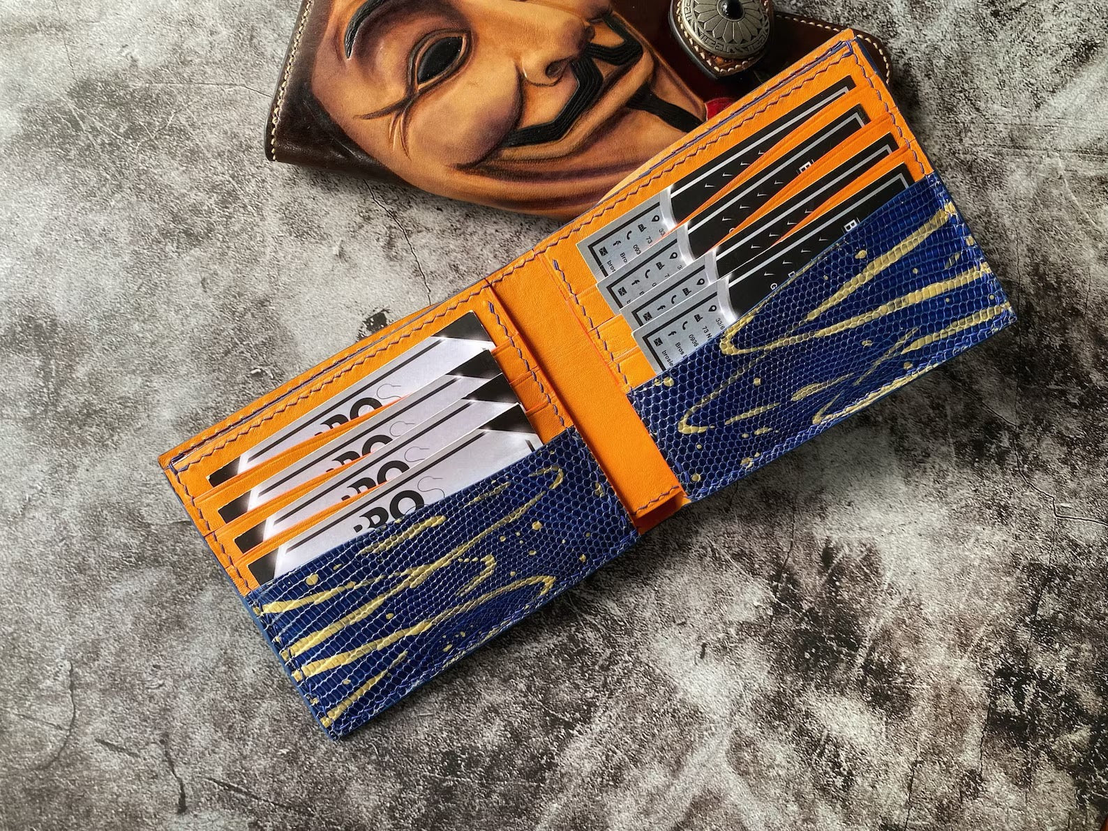 Handmade wallet is made of genuine Lizard Skin, featuring with cowhide leather. This combination makes the wallet look unique, soft to touch and flexible to put in your front pocket.