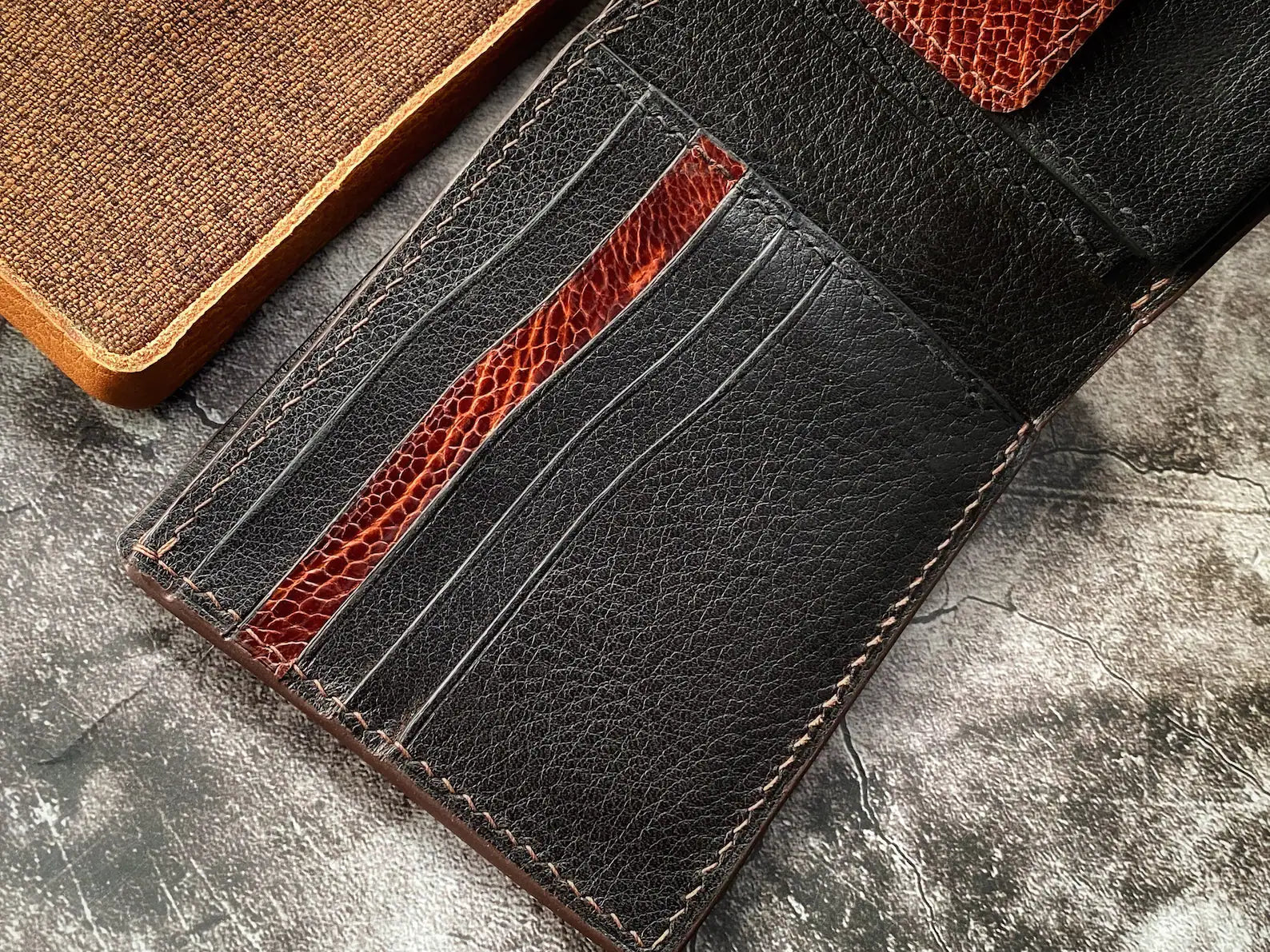 Handmade bifold wallet is made of genuine Ostrich Leg leather, featuring with cowhide leather. This combination makes the wallet look unique, soft to touch and flexible to put in your front pocket.