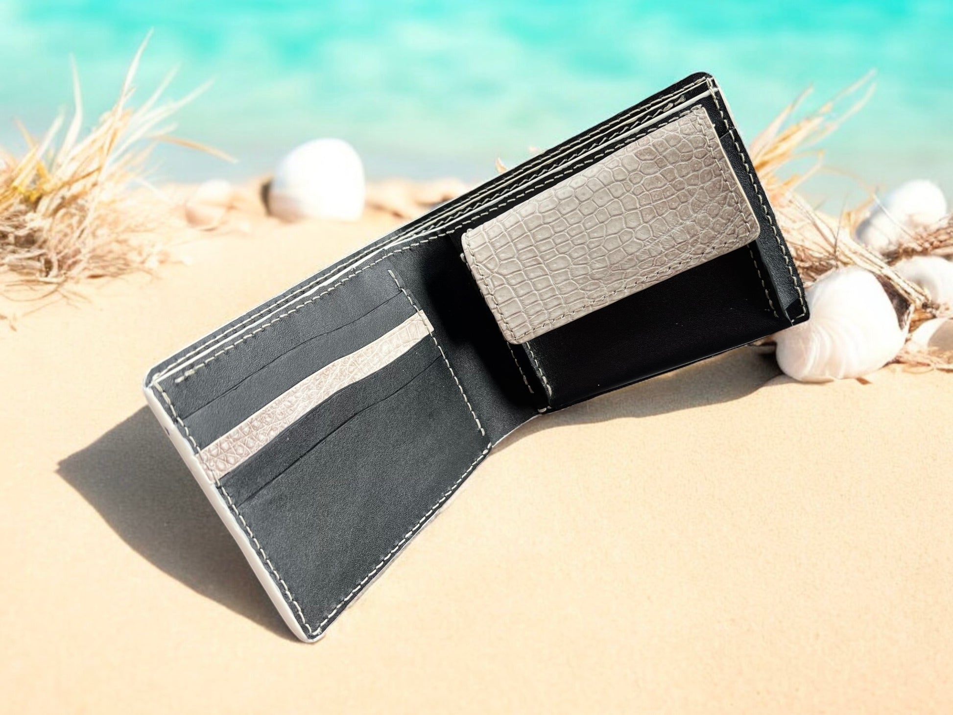 Handmade wallet is made of genuine Alligator Skin, featuring with Italy cowhide leather. This combination makes the wallet look unique, soft to touch and flexible to put in your front pocket.